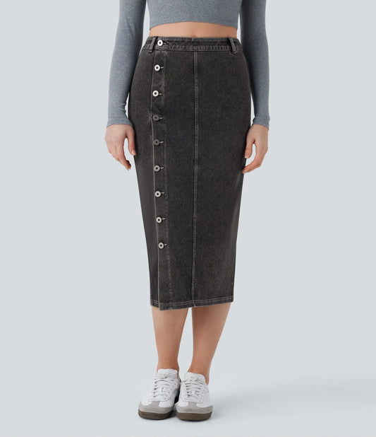 Halara Flex High-Waisted Stretchy Knit Denim Midi Skirt with Front Buttons